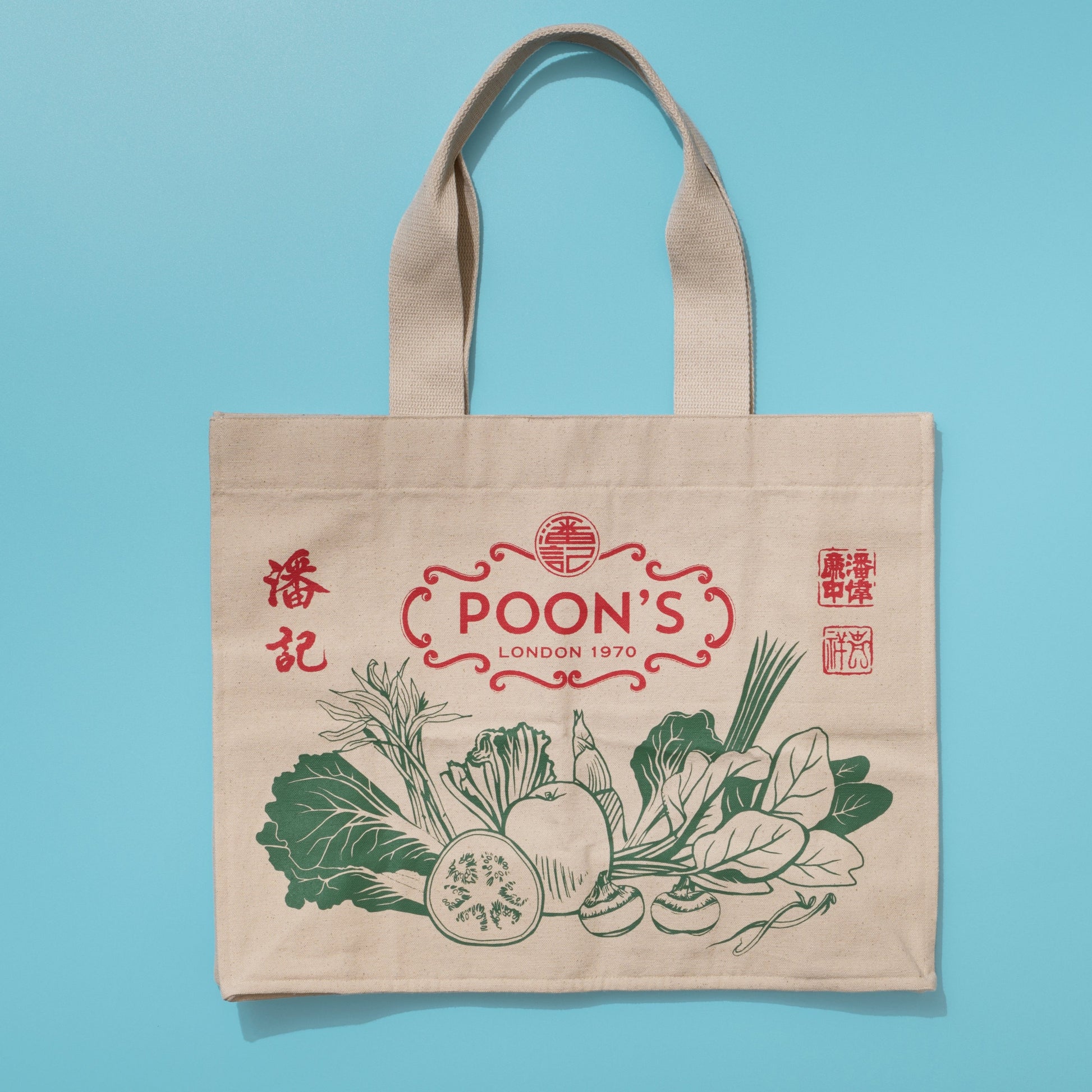Working with the super folk at re-wrap, who “craft enduring products with the most positive impact on people and the planet,” we are excited to launch our Poon's Vegetable Tote.  Six amendments later, we have a heavy-duty canvas bag with straps that will go over your shoulder, a gusset wide enough to fit a shoebox, a pocket for your phone, a loop for your keys, a pocket for your wallet and a sleeve to keep a bottle of wine or olive oil upright. We have had so many lovely comments about our vegetable tea towel that we decided to use the elements from this for the design.