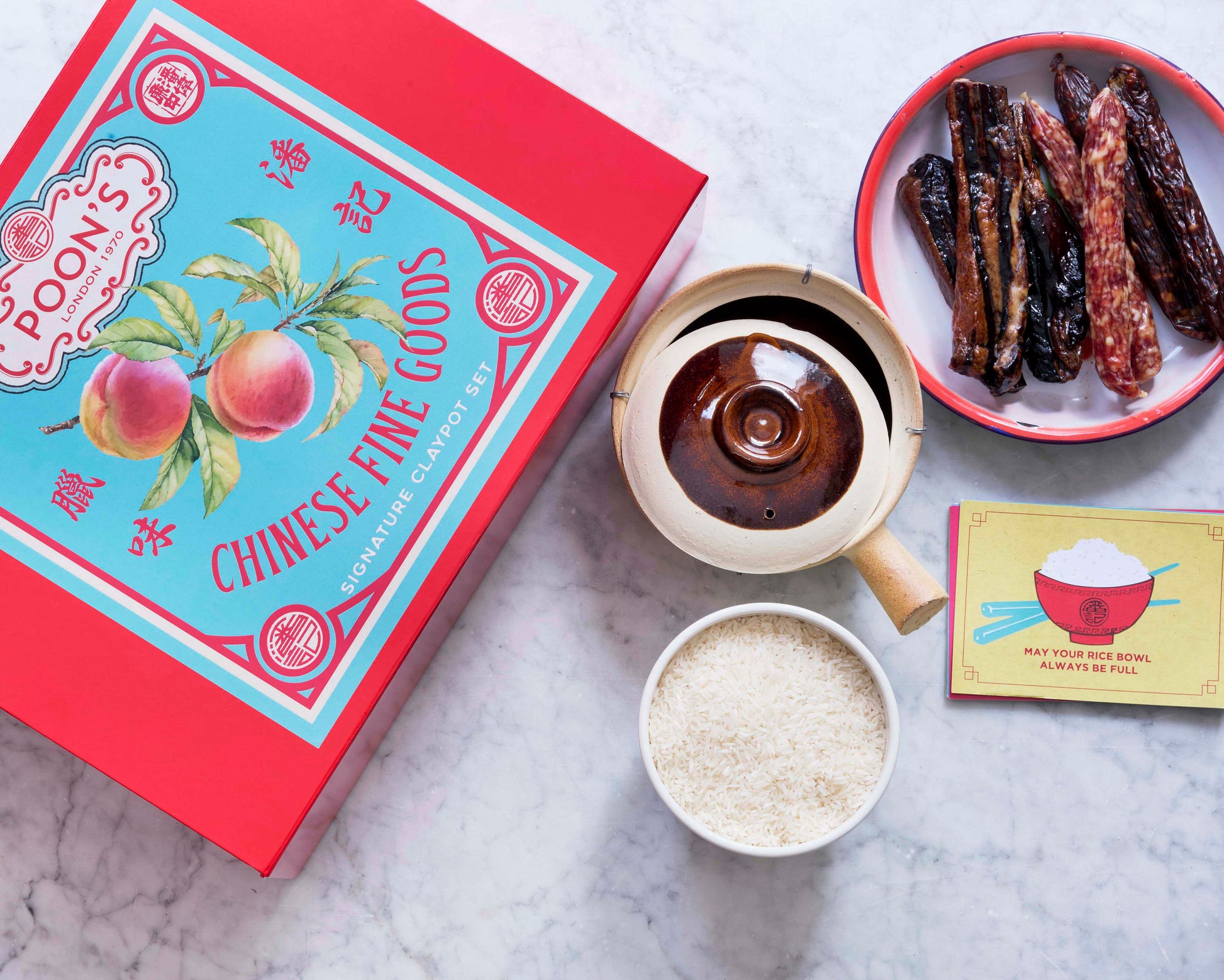 Each hamper contains a traditional Chinese claypot, Poon's Wind-Dried Pork Sausage, Poon's Wind-Dried Pork & Duck Liver Sausage, Poon's Chinese Wind Cured Bacon, Jasmine rice as well as a set of 10 Poon's postcards.