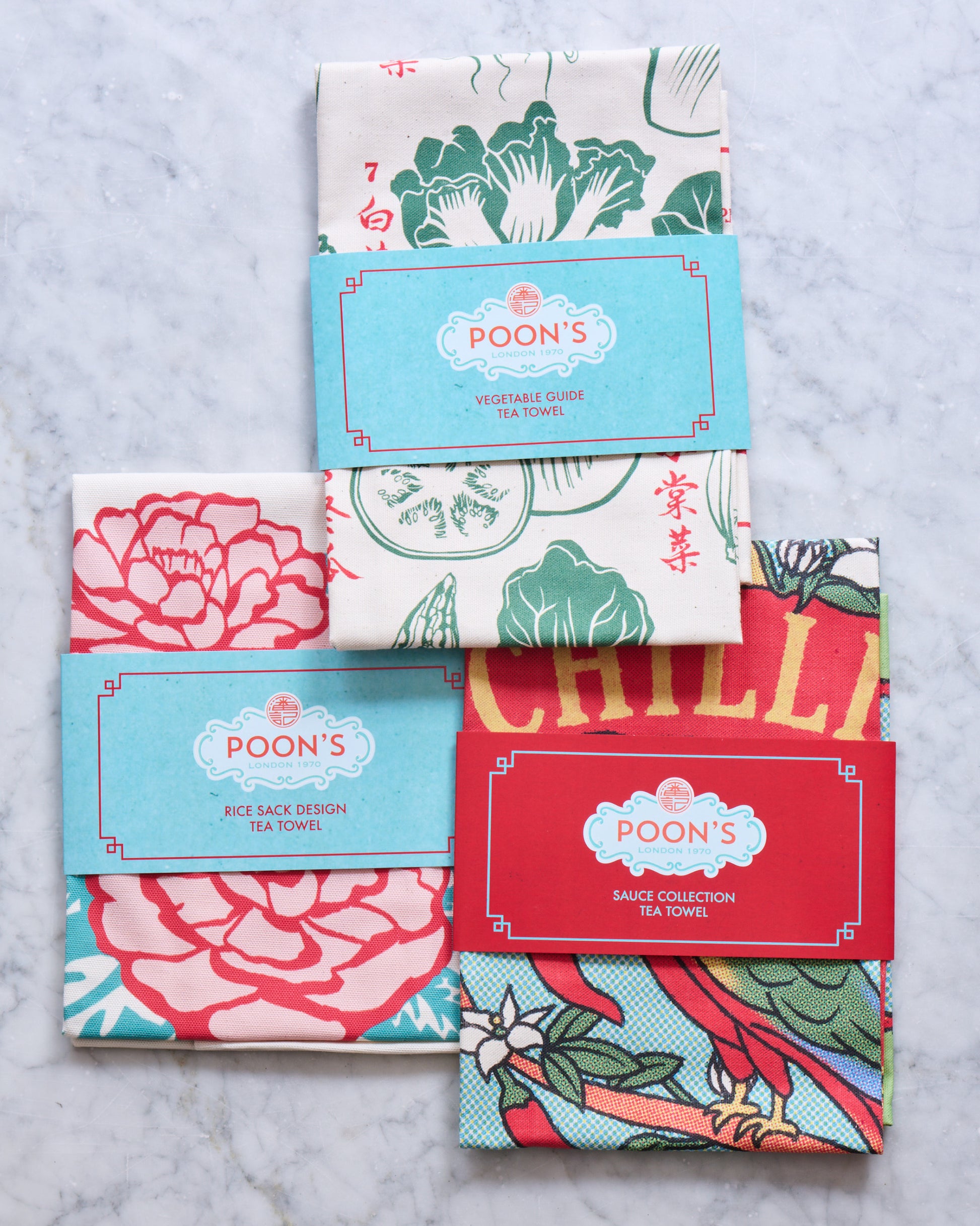 Our tea towel bundle includes one of each of our three designs; Sauce collection, Vegetable guide, and Rice sack design.